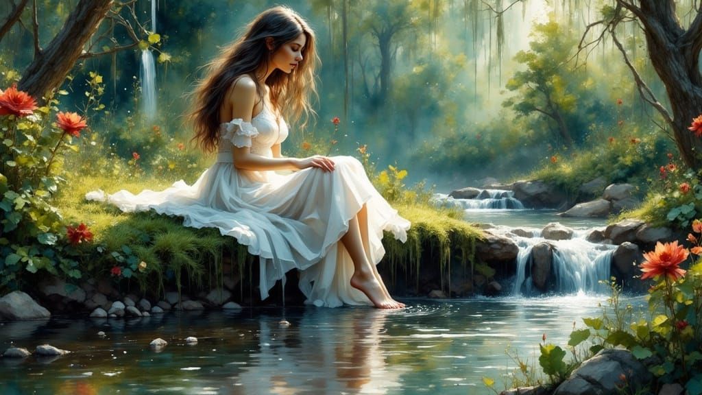 This image shows a beautiful woman in a white gown sitting on a rock and dipping her feet in a stream. Lush greenery and vibrant foliage surround her in this surreal, cosmic scene with a retro science fiction aesthetic.