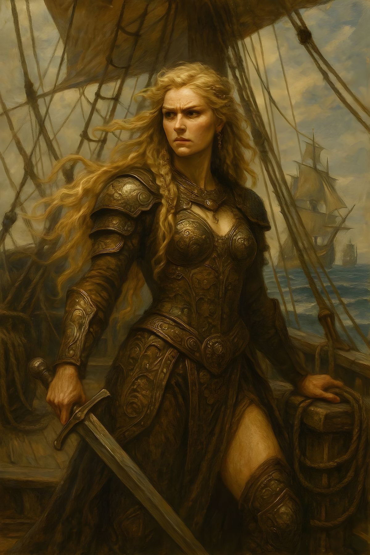 A digital painting of a formidable warrior queen on a ship. She has long blonde hair and wears ornate leather armor. The background features an ocean with sailing ships in soft lighting, with a mood of regal power.