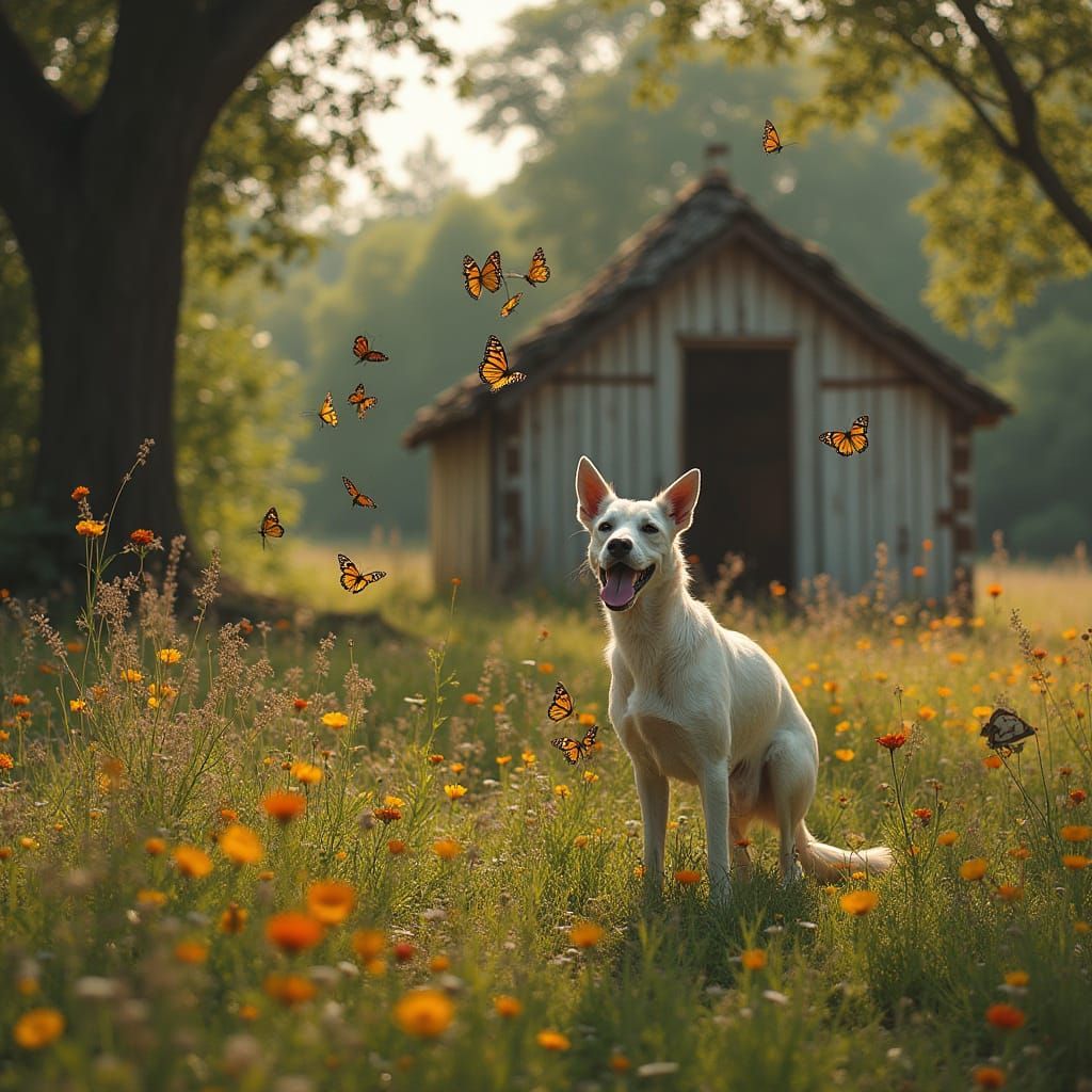 This image shows a sheepdog in a flower-filled field surrounded by butterflies. In the background are a cabin and trees, completing the pastoral scene.
