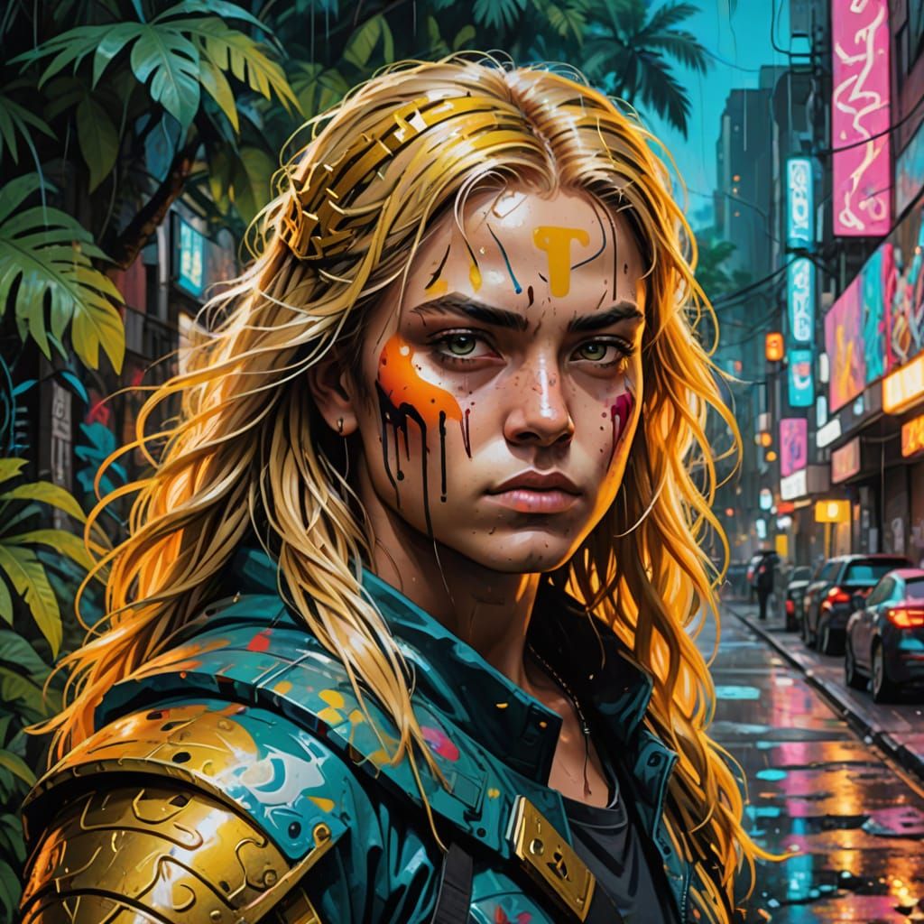 This image shows a golden-haired warrior guarding a jungle city. The artwork is in a vibrant, urban street art style, featuring glossy spray paint textures and neon lights.