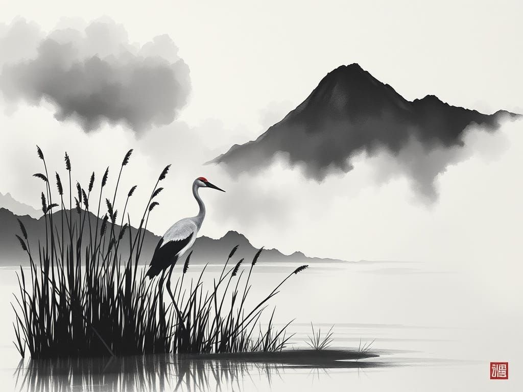This image shows a crane standing in reeds at dawn, rendered with delicate linework and soft ink washes. The misty mountain landscape creates an ethereal atmosphere as a monochrome ink wash.