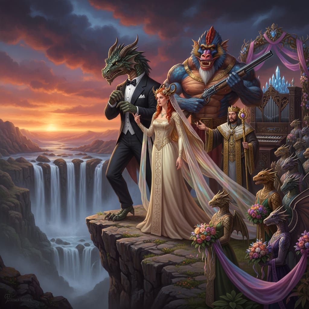 A gargantuan dragon groom nervously prepares for his wedding on a cliff. The father of the bride, a dragon, holds a shotgun. Digital painting with dramatic lighting and epic scale.