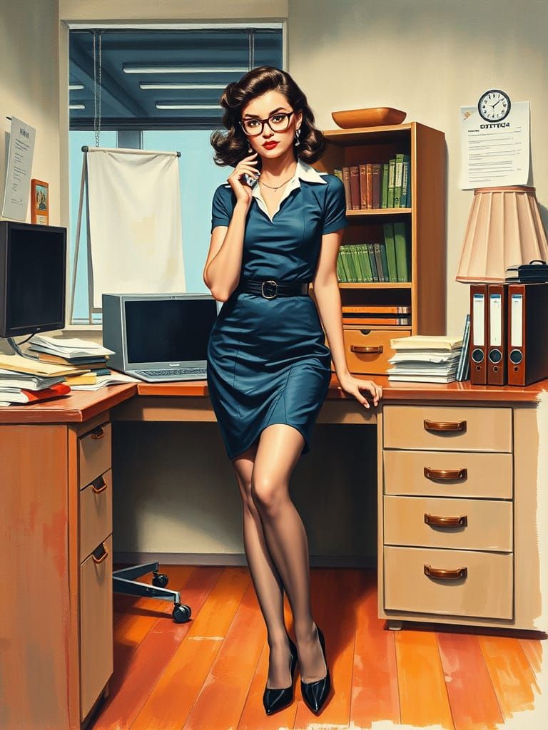This image shows a pin-up style 1950's secretary in a vintage office setting. The artwork evokes the classic pin-up style through mixed media techniques.