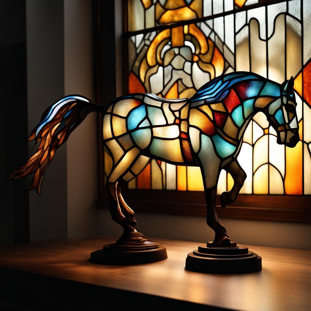 A stunning image of a stained glass horse lamp with glowing eyes. The lamp features intricate, organic motifs and dramatic lighting, rendered as high-quality CGI fine art.