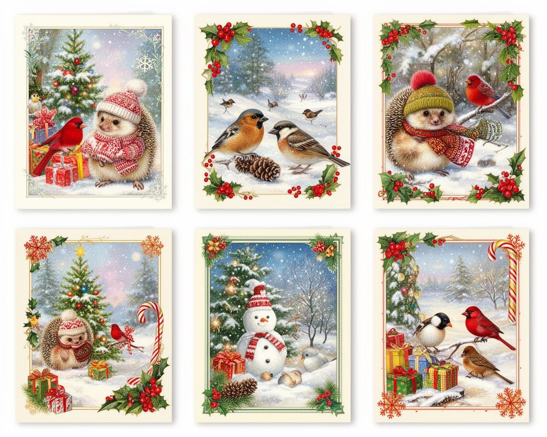 A collection of vintage-style Christmas cards featuring cute woodland animals, snowmen, and festive holiday elements. The art has a whimsical, magical feel with watercolor textures and bright colors.
