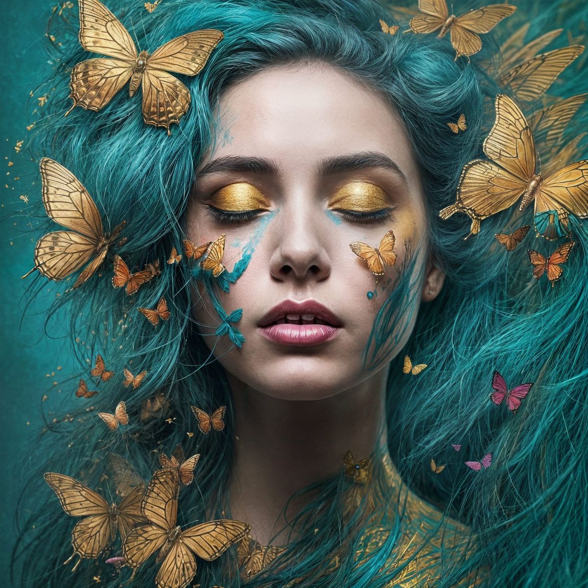 A captivating portrait of a woman with vibrant makeup and closed eyes. Her hair merges with wildflowers and butterflies against a watercolor backdrop. This image showcases fantasy realism with fine art elegance.