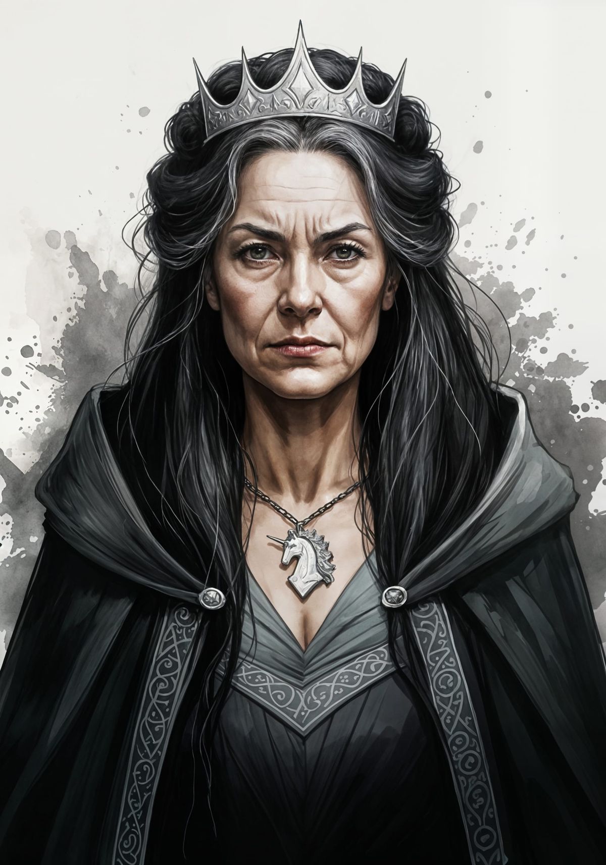 A stern yet elegant queen, adorned with a silver crown and a white unicorn pendant, wears her age with distinction in this striking ink drawing, blending modern and abstract techniques.