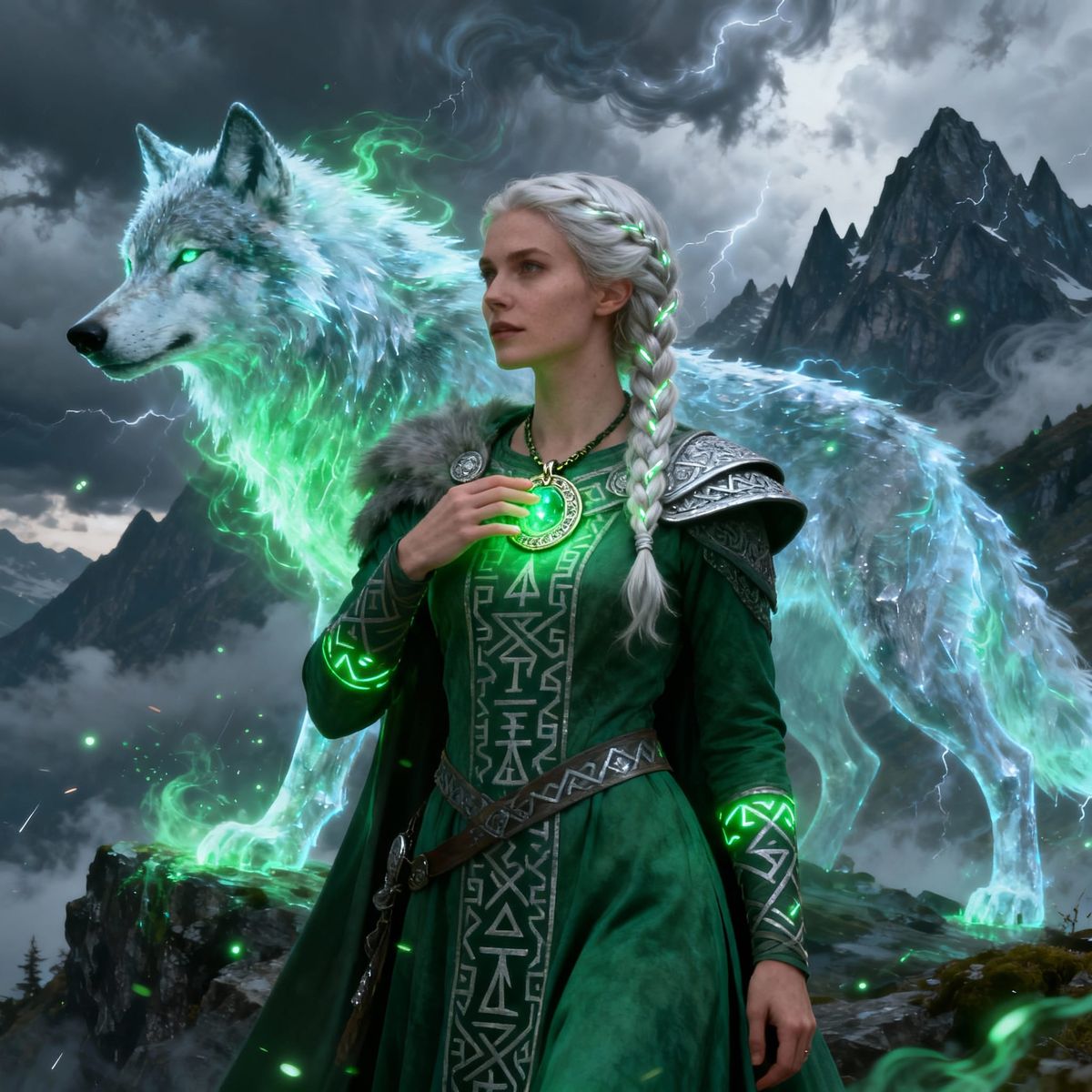 A majestic Viking queen, adorned in an emerald rune-embroidered dress and fur cloak, touches her glowing emerald medallion. This summons a towering spectral frost wolf from its aura, its icy form shimmering with green energy. The stormy mountain peak and her determined gaze emphasize the magical bond between her and the wolf spirit.