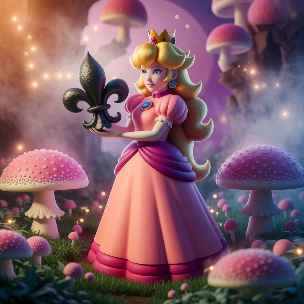 This enchanting image depicts Princess Peach standing elegantly amidst a mystical landscape, surrounded by soft, glowing lights and intricate details, reminiscent of magical realism and vibrant mixed media artworks.
