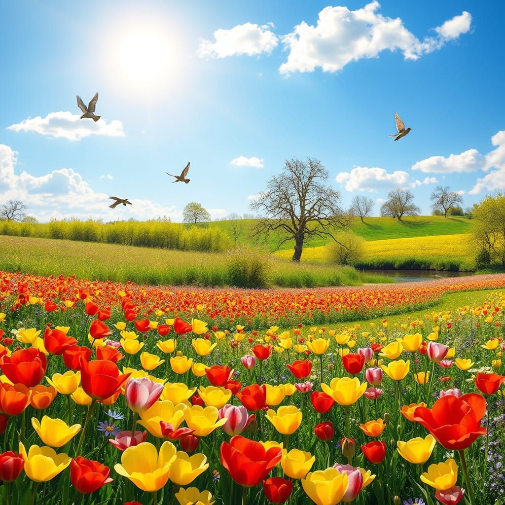 Easily create your own colorful spring images with our free AI image generator, featuring blooming flowers and sunny skies.