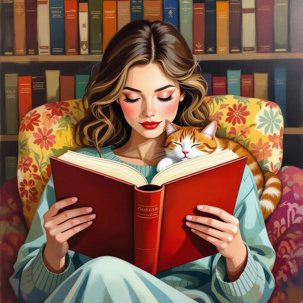 This image shows a woman engrossed in a large book, with a cat peacefully sleeping nearby. Rendered as a detailed gouache painting, it captures a quiet, intimate moment.