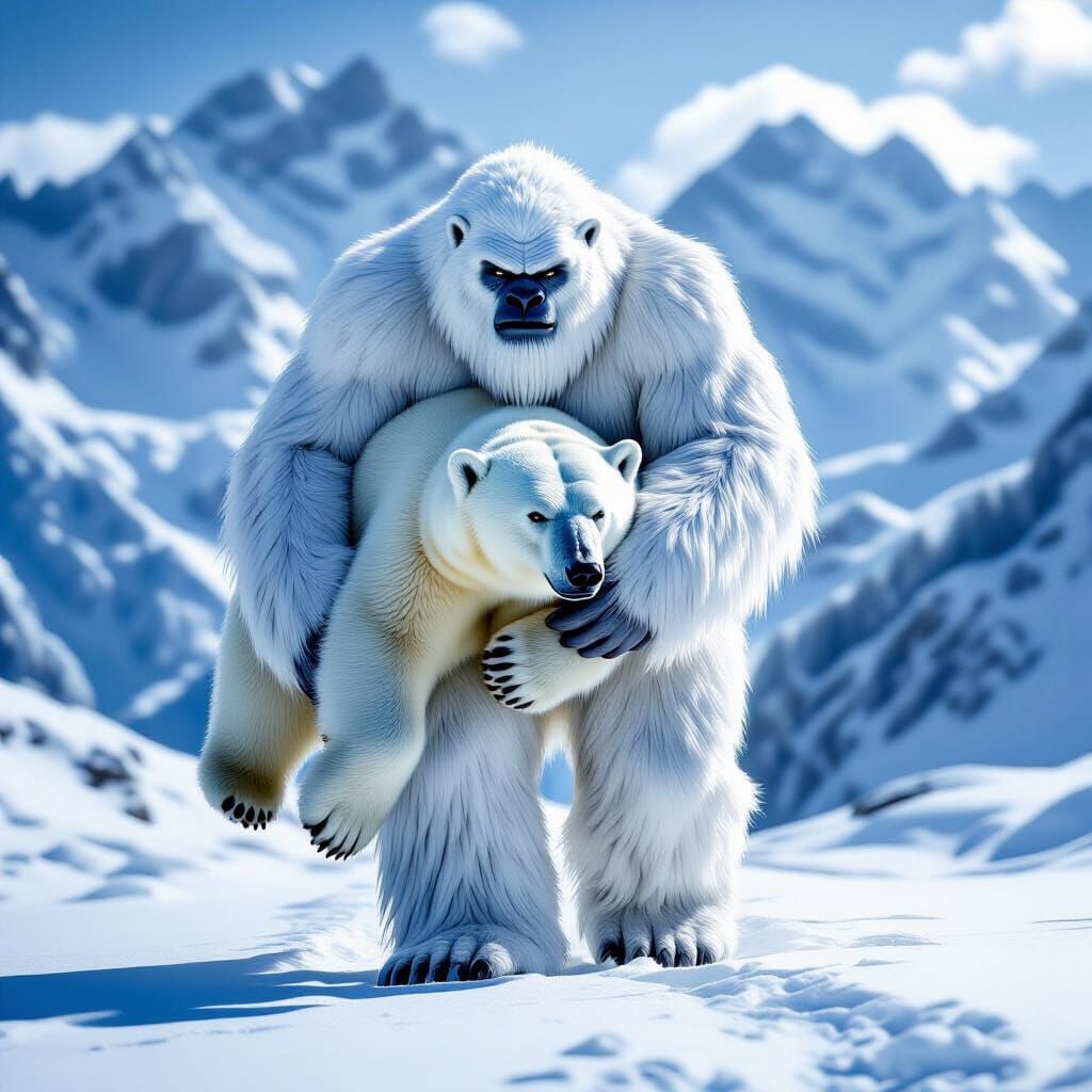 A hyperrealistic, cinematic image of a massive white Yeti traversing the snowy Alps, carrying a polar bear. The scene features intricate details, high contrast, and a moody atmosphere.
