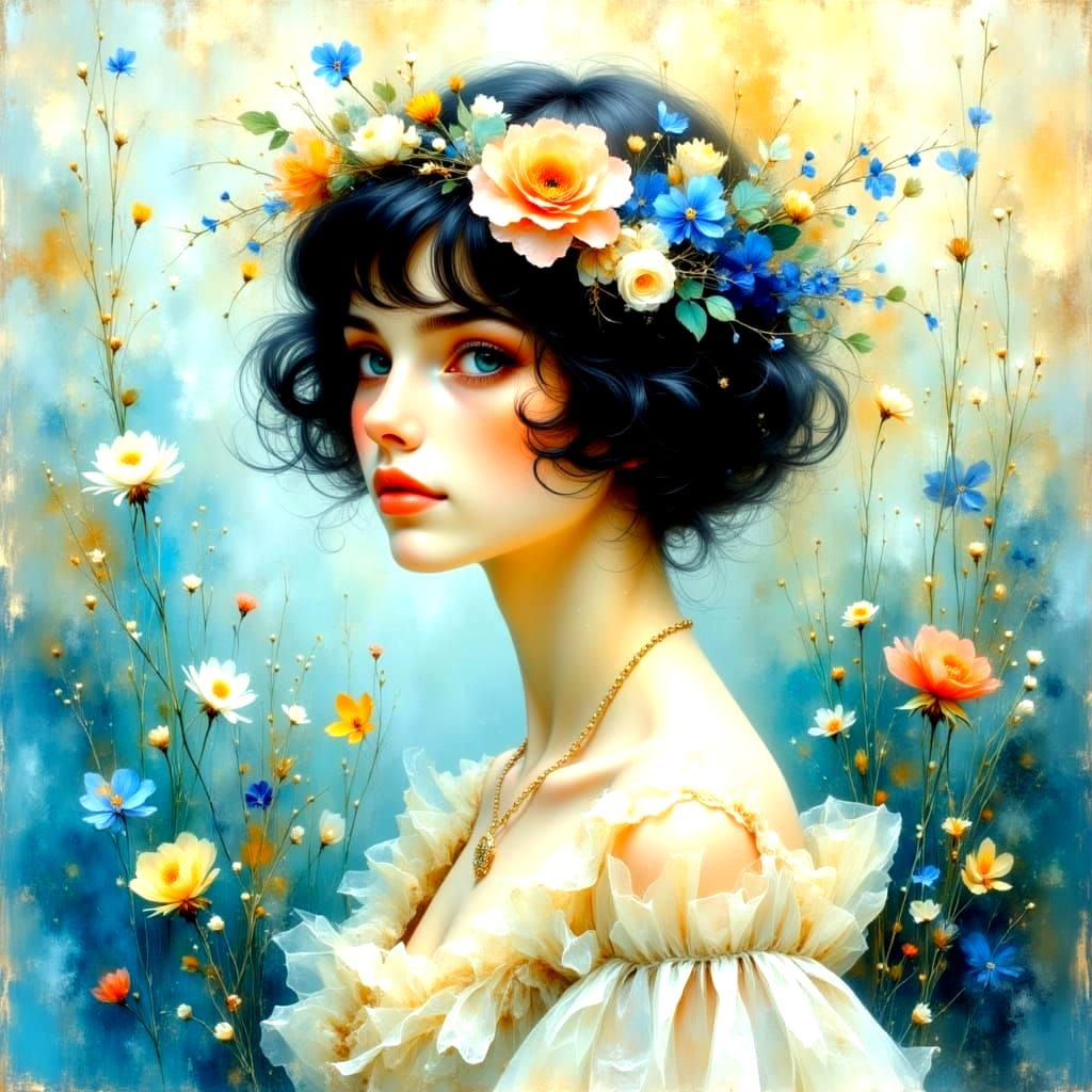 A dreamy watercolor painting of a girl in a 1920s style with a floral headband. The artwork uses soft focus and impasto techniques to create an ethereal, magical atmosphere.