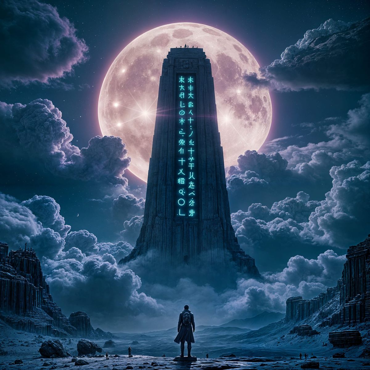 This image shows a lone explorer silhouetted against an ancient alien monument piercing the clouds. The dramatic lighting and deep purples and blues evoke a sense of discovery. As a cinematic still, the image emphasizes scale and mystery.
