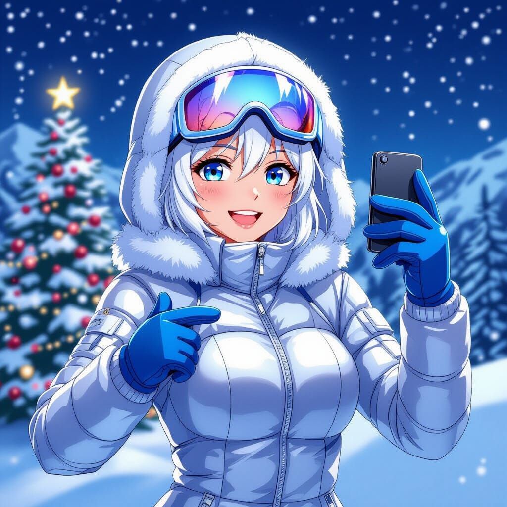 This anime-style illustration features a smiling, athletic woman with white hair and blue eyes posing for a selfie in a snow-covered landscape at night, wearing a shiny ski suit and goggles. Rendered with deep colors and cel-shading.