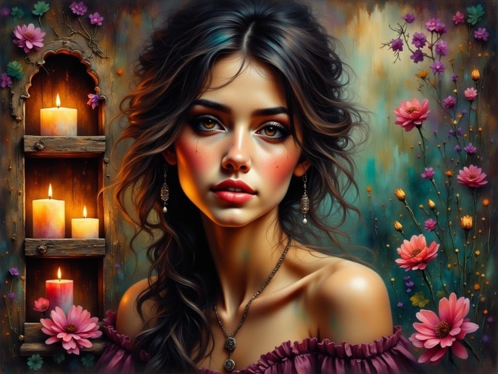 This image is a mystical oil painting of a woman surrounded by candles in a whimsical garden at night, featuring a warm smudge grunge palette with purple, red, green, and yellow hues, reminiscent of expressive brushstrokes and vibrant colors.