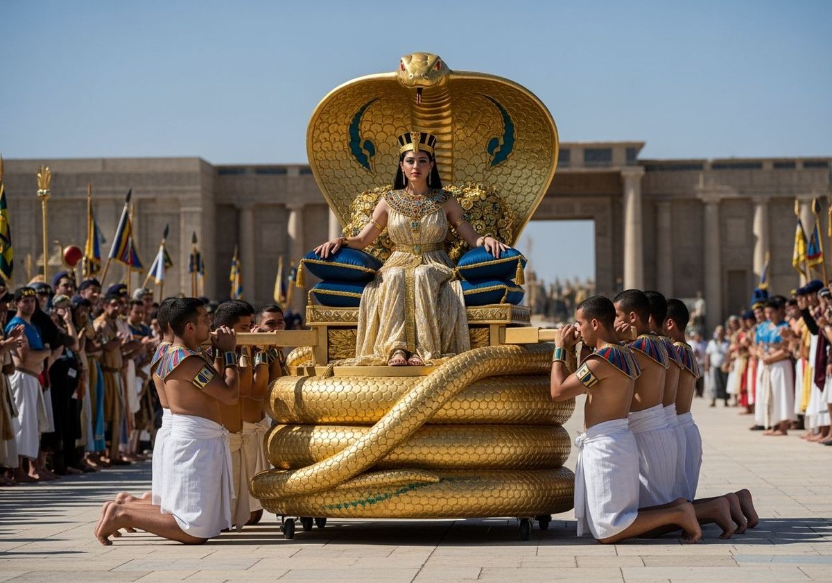 This image shows the Queen of Egypt carried on a massive gold throne shaped like a coiled cobra, adorned in gold and emeralds. One hundred servants carry her as a crowd kneels.