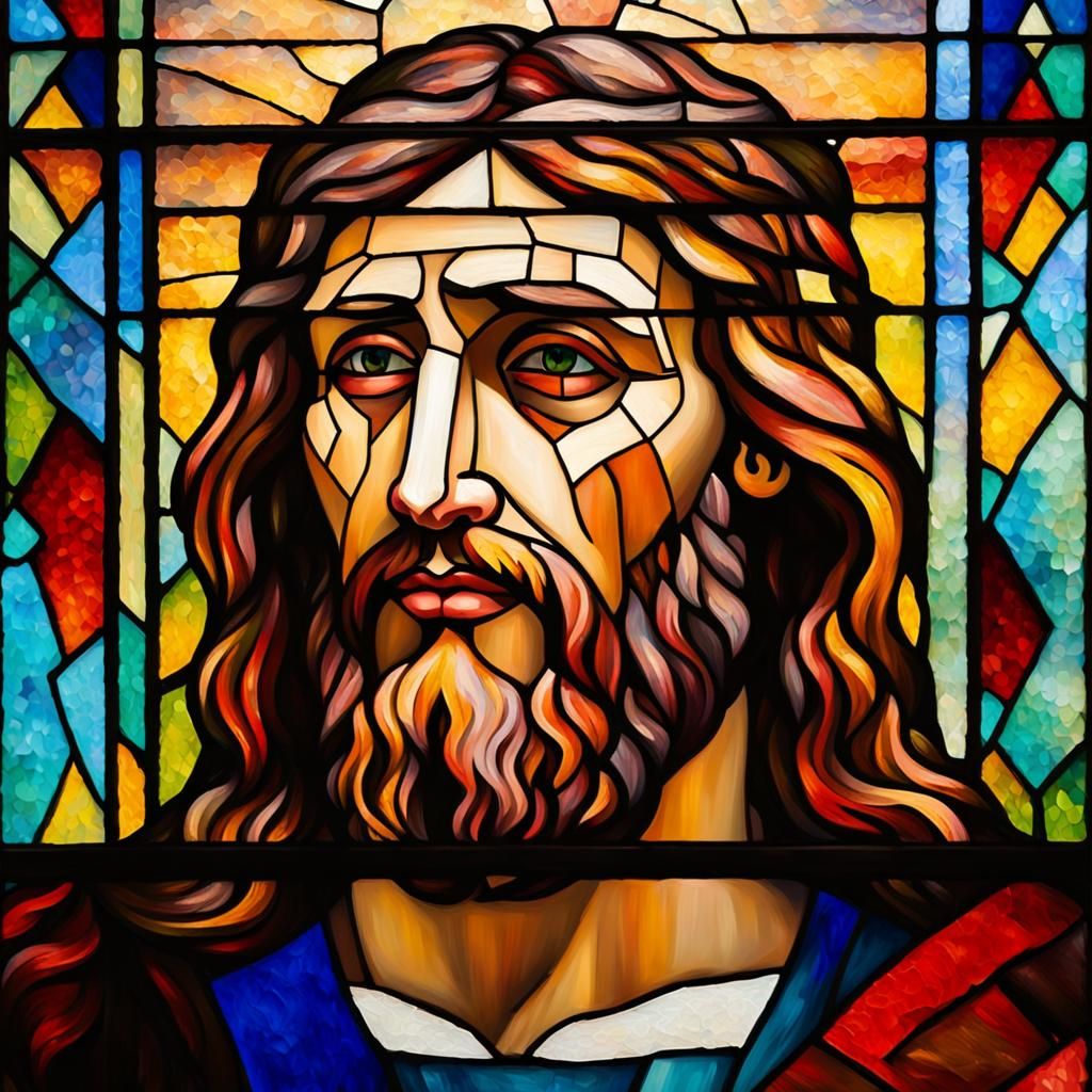 A stained glass portrait of Jesus Christ holding the Ten Commandments. This image evokes neo-impressionism with the vibrant colors and textures of an oil painting.