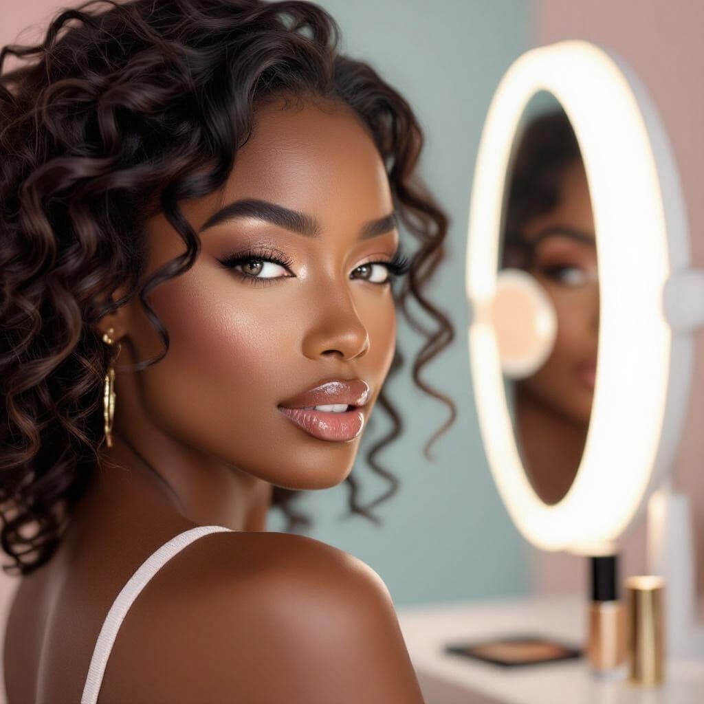 A stunning portrait of a confident Black woman with wavy twists, showcasing minimal natural makeup at a chic dressing table. Captured with cinematic lighting in a soft pastel setting, this image embodies a TikTok beauty influencer aesthetic.