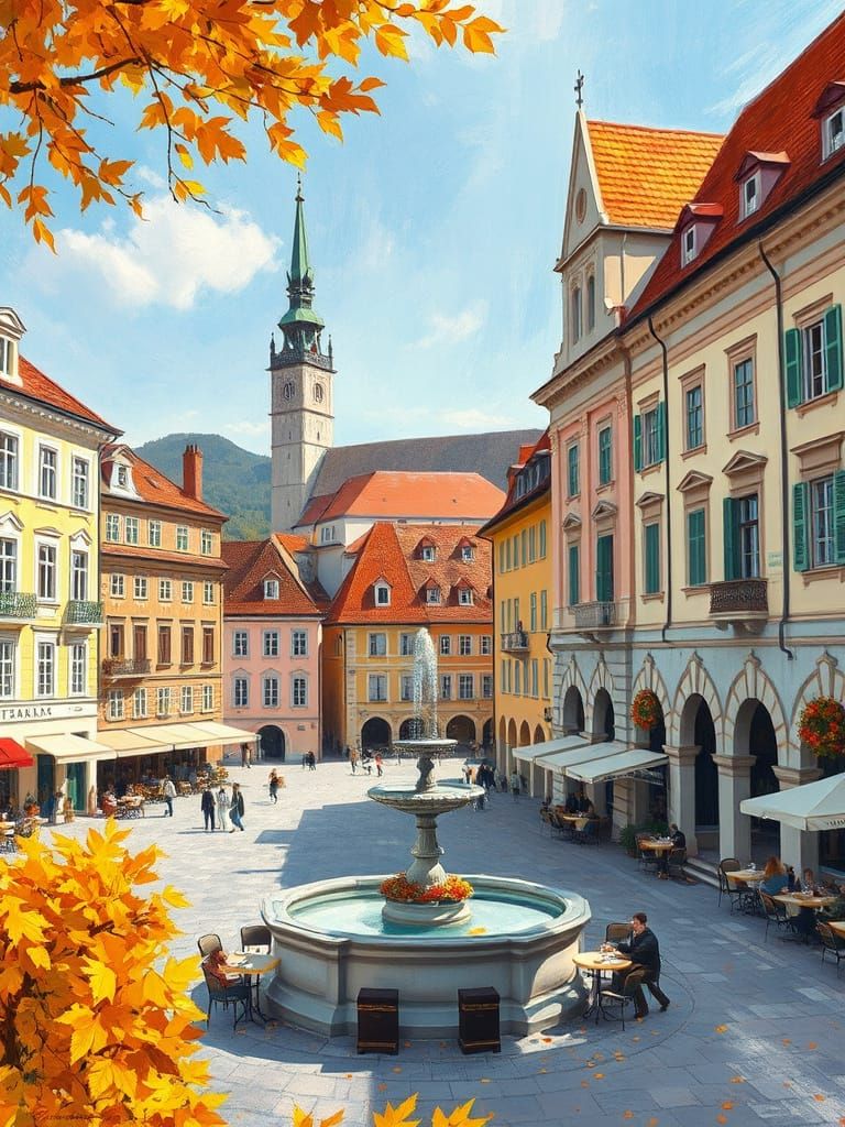 This image captures Bratislava's Old Town Square in autumn, rendered in an impressionist oil painting style. Pastel Baroque buildings, ornate facades, and colorful fall leaves create a charming Central European scene.