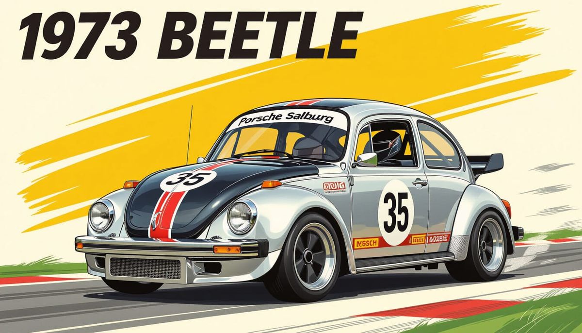 This image showcases a 1973 Volkswagen Super Beetle race car, number 35, featuring a vintage silver Porsche Salzburg design with sponsor graphics. Rendered in a bold, dynamic 70s motorsports poster illustration style.