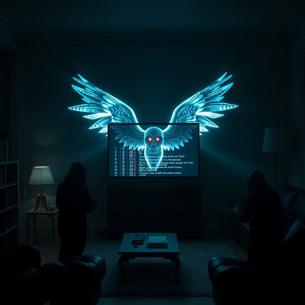 This image depicts MIB agents facing a smart TV that has transformed into a Weeping Angel with glowing red eyes, emitting digital signals in a shadowy, eerie living room.