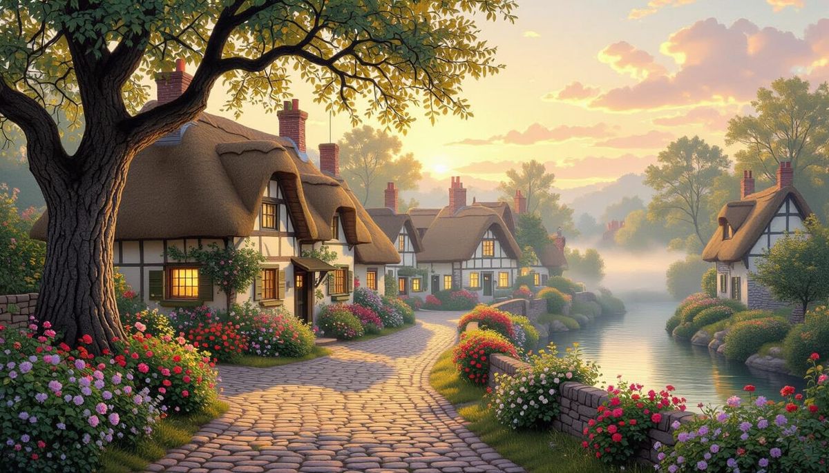 A picturesque village scene at dawn featuring cobblestone streets and quaint cottages. The golden light and gentle mist create a cozy, rustic atmosphere reminiscent of impressionist paintings.