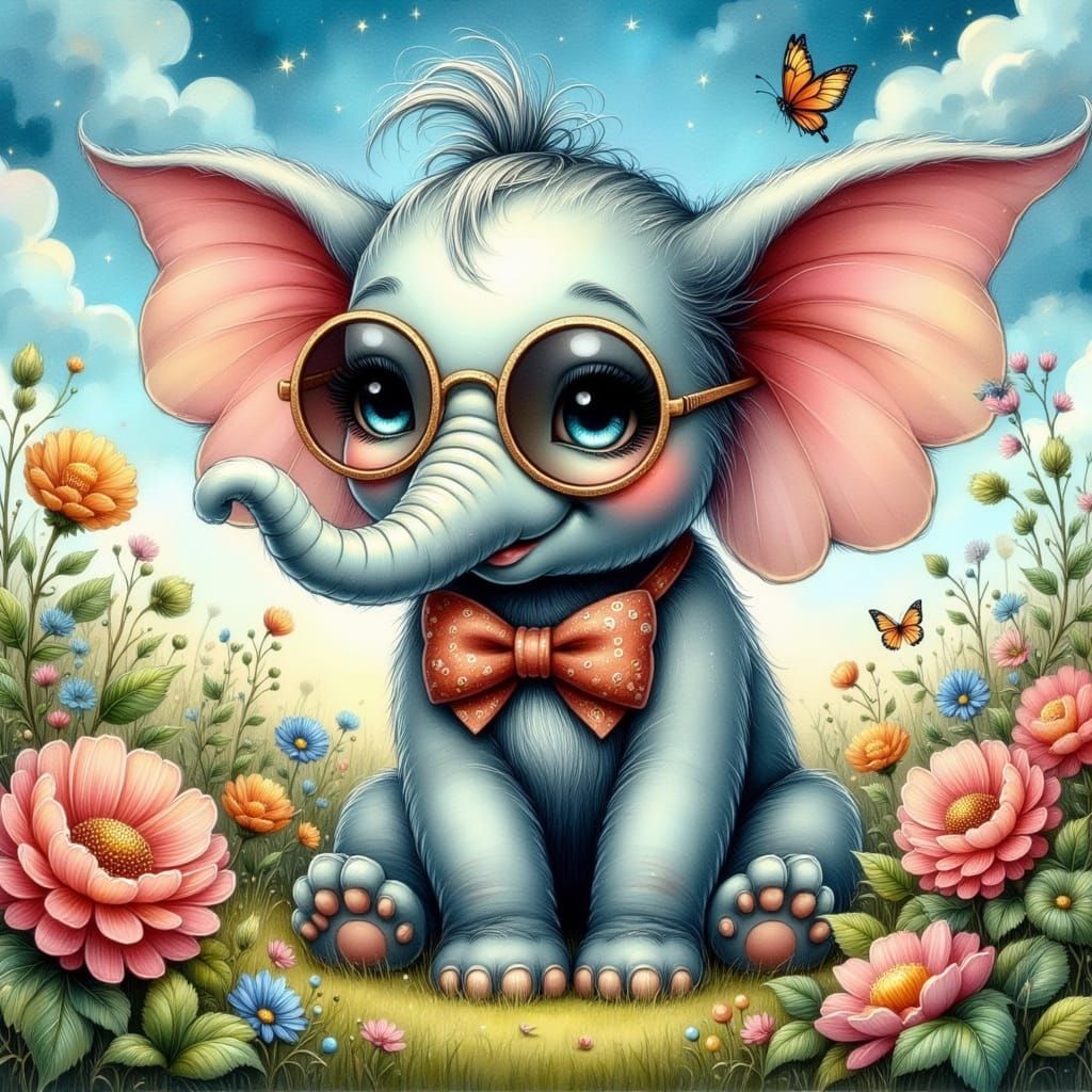 This vibrant airbrush illustration features a baby elephant with soft pink ears and trendy sunglasses, sitting amidst a kaleidoscope of colorful flowers in a lush meadow. The atmosphere is serene and idyllic, with butterflies flitting about and a brilliant blue sky with light clouds.