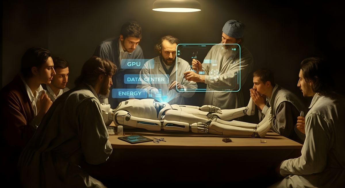 This image shows a robot being dissected by a doctor, surrounded by students. Ethereal blue light highlights holographic technical terms like GPU and Data center, rendered in a 17th-century Renaissance oil painting style.