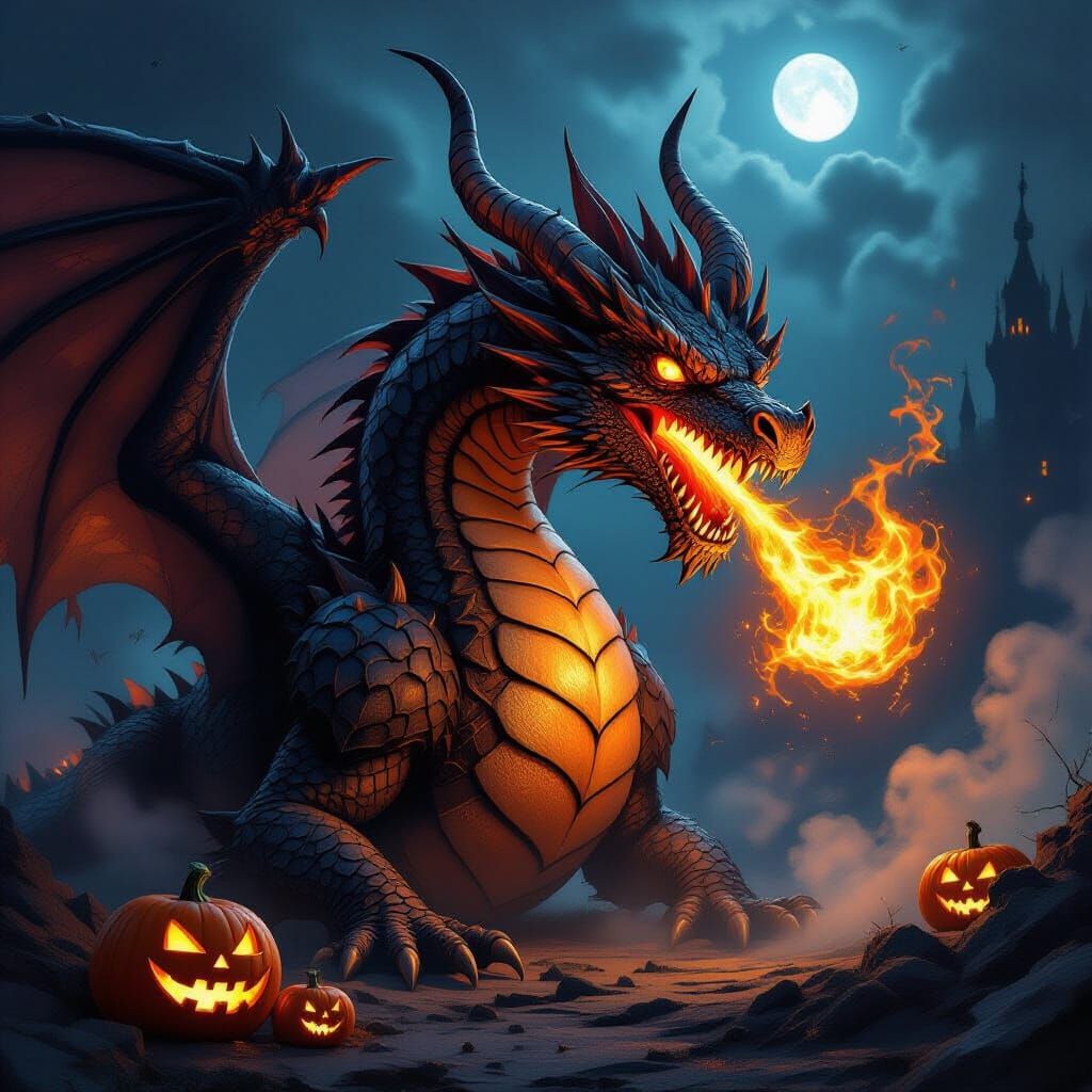 This image showcases a majestic, fire-breathing dragon with Halloween elements like jack-o'-lanterns and cobwebs in a dark fantasy setting. Created with dramatic lighting and deep jewel tones, it features an epic scale and glowing embers.