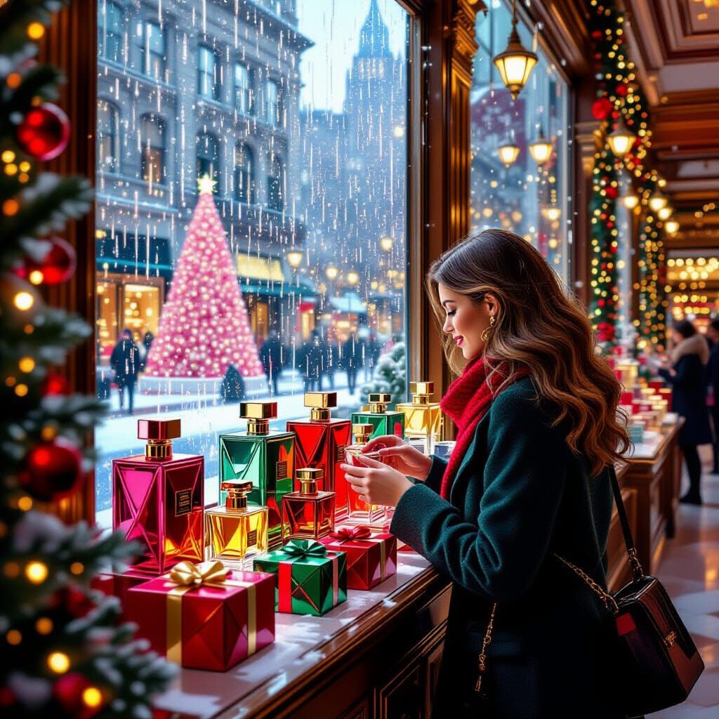 This image captures the festive holiday spirit of Christmas shopping in a bustling downtown Manhattan department store. See shoppers selecting perfumes amidst shimmering decorations and a pink Christmas tree, with a golden hour glow.