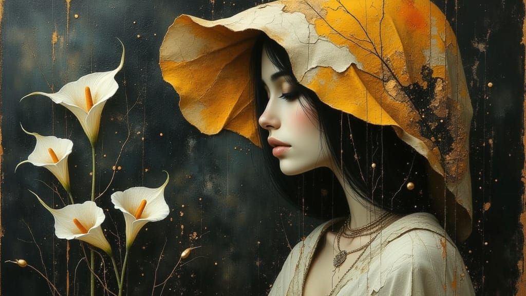 A haunting portrait of a thoughtful woman with her head wrapped in cloth. The artwork blends surrealism and magic realism in grainy, vintage style with transparent color layers and a muted palette.