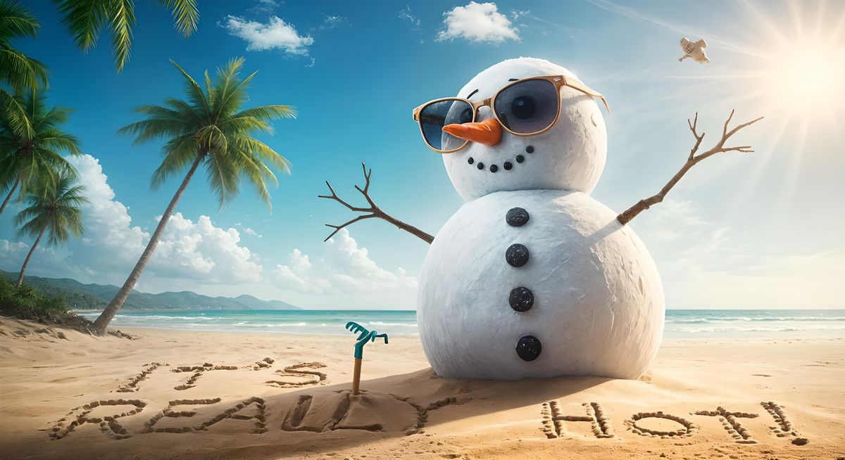 A centered, hyperdetailed image of a snowman sweating on a beach. The snowman is building the phrase "it's really hot" out of sand, with triadic colors and sunbeams.