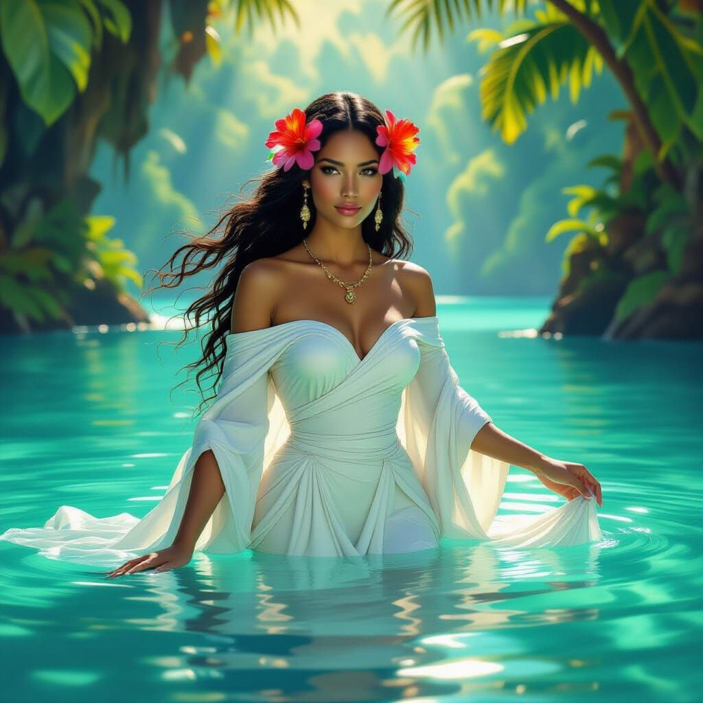 "A serene Polynesian goddess emerges from the turquoise waters of a hidden lagoon, her long dark hair adorned with vibrant hibiscus blossoms, sunlight dappling across her bronze skin as she raises her hands in a gesture of peace and welcome. The air is filled with the sweet scent of plumeria and the gentle sound of waves lapping against the shore. The scene is bathed in warm, golden light, reminiscent of a vintage travel poster, with a touch of surrealism, evoking the style of ..."