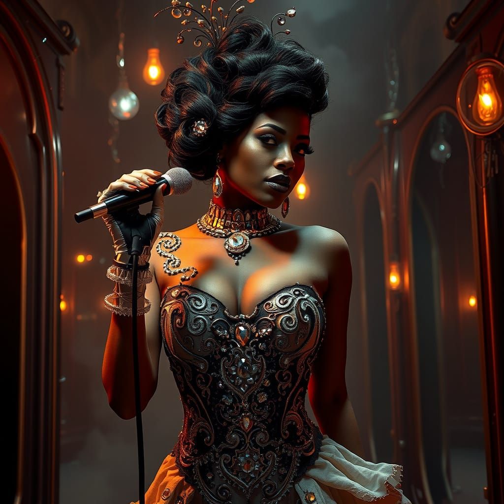This image depicts a stunning black diva in a bejeweled, Victorian-inspired gown, surrounded by shattered mirrors and industrial-chic decor, with a cybernetic microphone in hand, evoking a blend of art deco and industrial aesthetics.