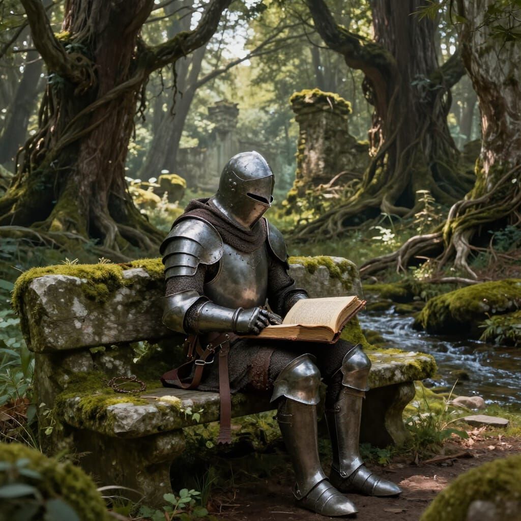 Generate unique images of knights in armor, reading books in forest clearings. Free and easy AI image creation.