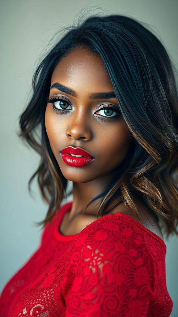 A realistic portrait of a light-skinned Afro-American woman with silky black hair and turquoise eyes. She's wearing a red lace top and glossy red lip gloss, captured with soft lighting.