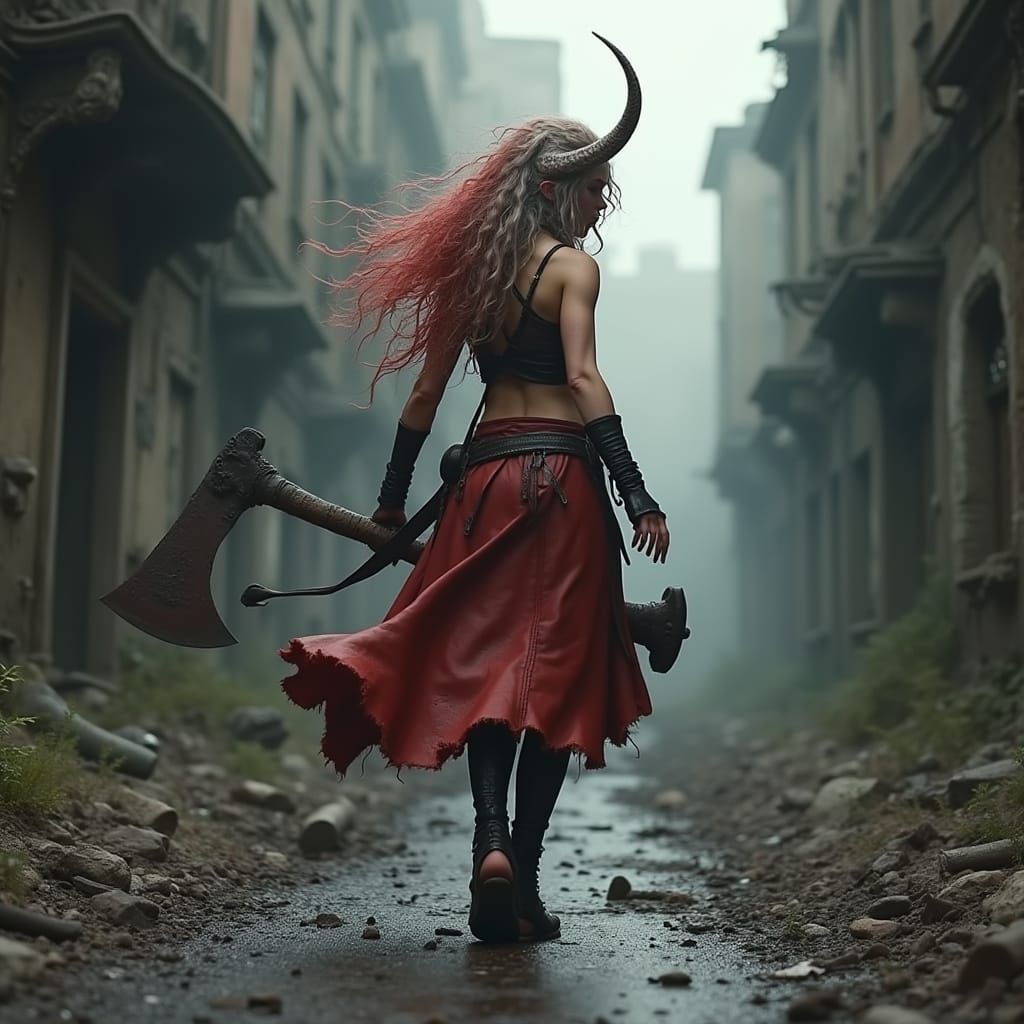 This image depicts an albino elf maiden with silver hair in a red leather outfit, armed with a hatchet, navigating a deserted, wicked city. The scene features dramatic, atmospheric lighting and intricate textures, evoking a sense of epic cinematic storytelling.