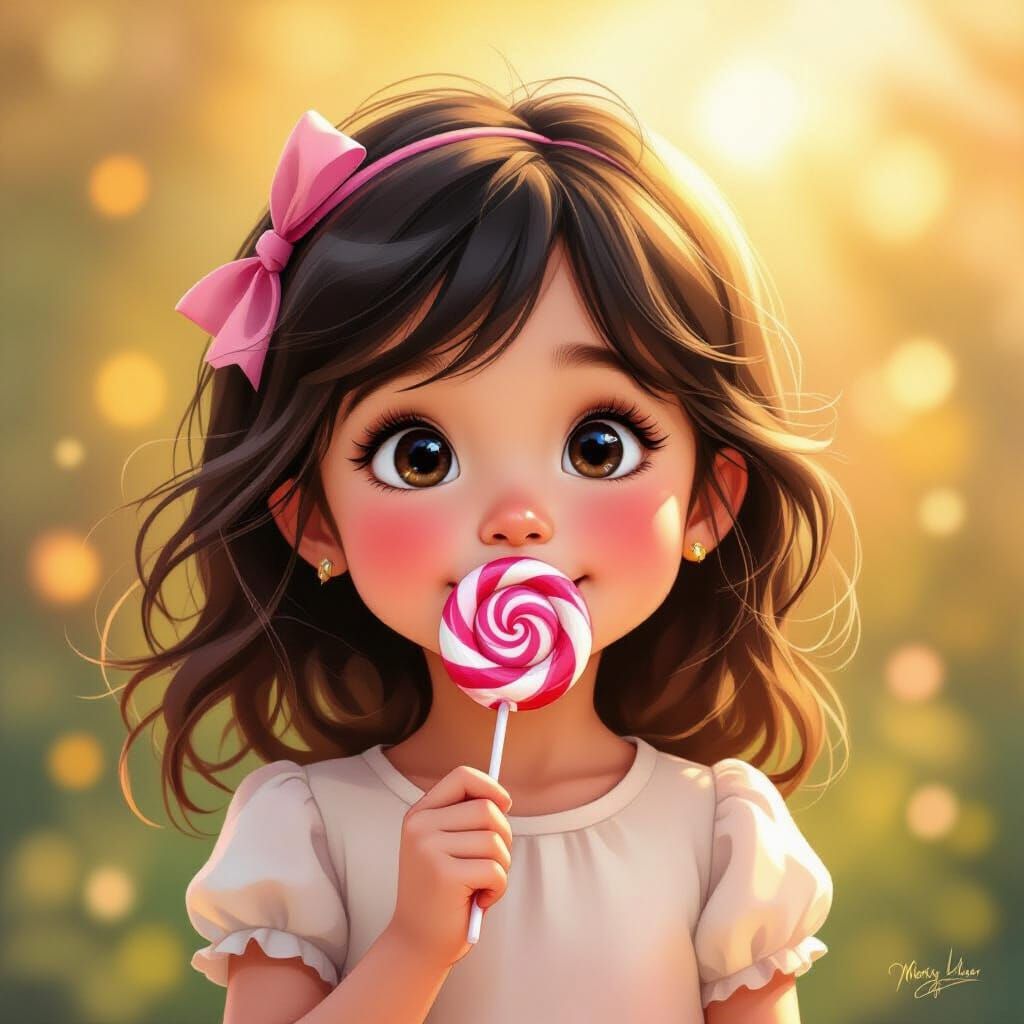 A charming storybook illustration of a young girl joyfully licking a lollipop. The scene features vibrant colors and warm, golden hour lighting, creating a soft, dreamy atmosphere.