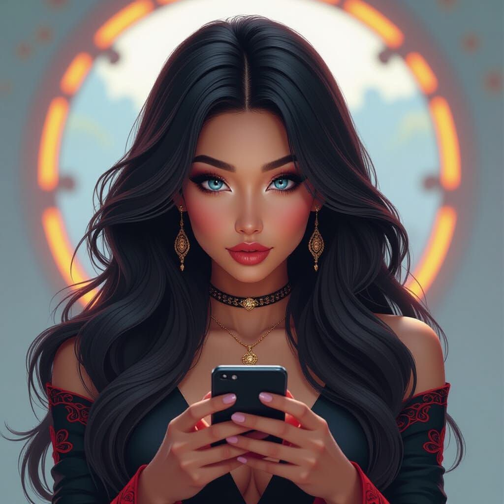A hyperdetailed portrait of a woman with mixed heritage, featuring flowing hair, blue eyes, and tanned skin. She wears black and red while texting, captured with dynamic lighting and vibrant colors in a concept art style.
