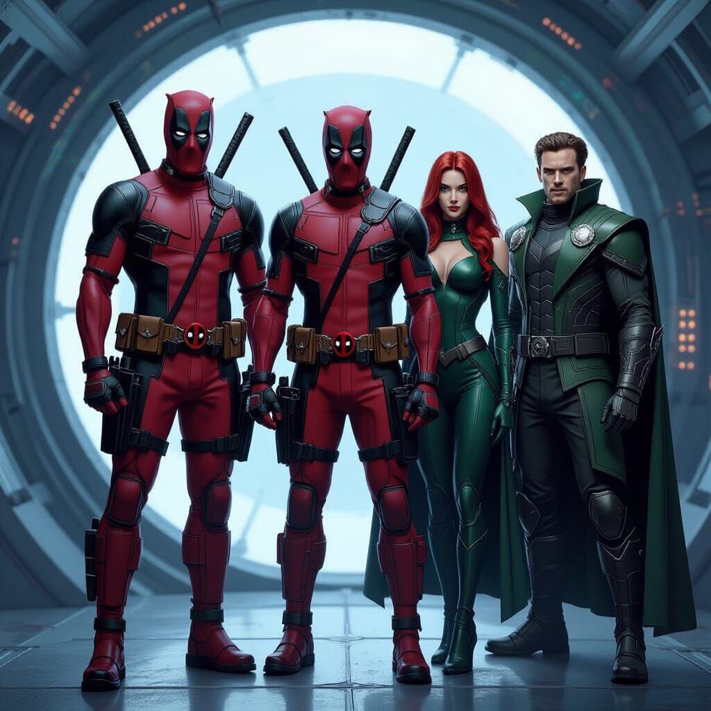 This image shows Deadpool, Wanda Maximoff, Loki, Mobius, and the Winter Soldier together at the TVA. The scene has a dark, futuristic aesthetic with intricate details and metallic textures.