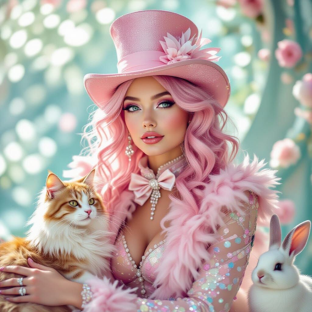 A whimsical scene features a glamorous figure with pink hair, wearing a sparkling outfit and a top hat, accompanied by a fluffy cat and surrounded by playful rabbits in a pastel setting. Reference to a futuristic Alice in Wonderland.