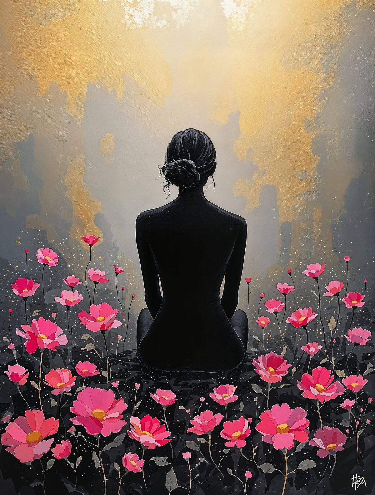 This image depicts a woman in a contemplative mood, surrounded by bold, textured flowers in a muted palette with warm golden light. The background features a rich, metallic gold backdrop with dramatic highlights and deep shadows.
