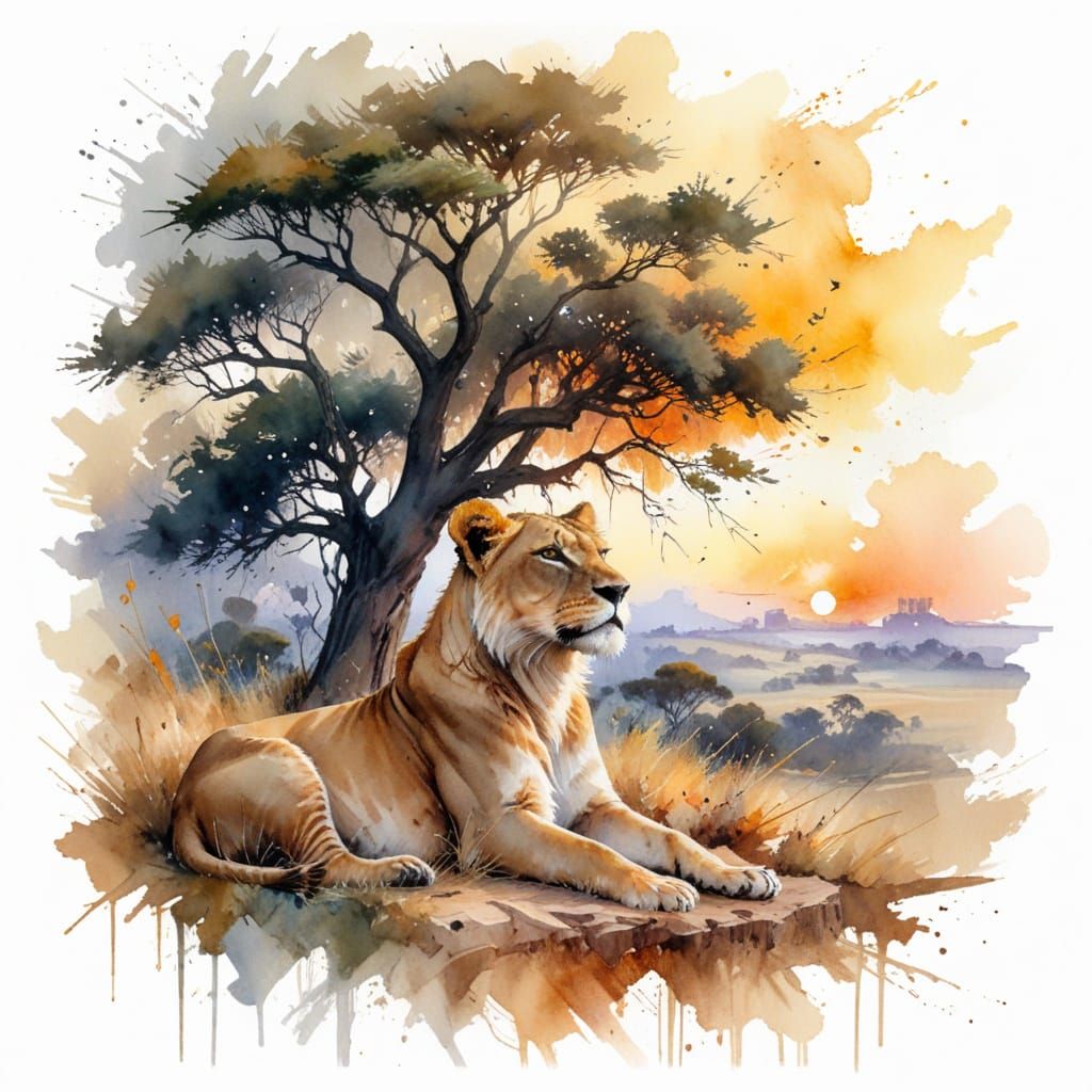 This image is a serene depiction of a wind-swept savanna at dusk, with an acacia tree silhouetted against a golden horizon and a lioness reclining in the foreground, created in a stylized watercolour aesthetic