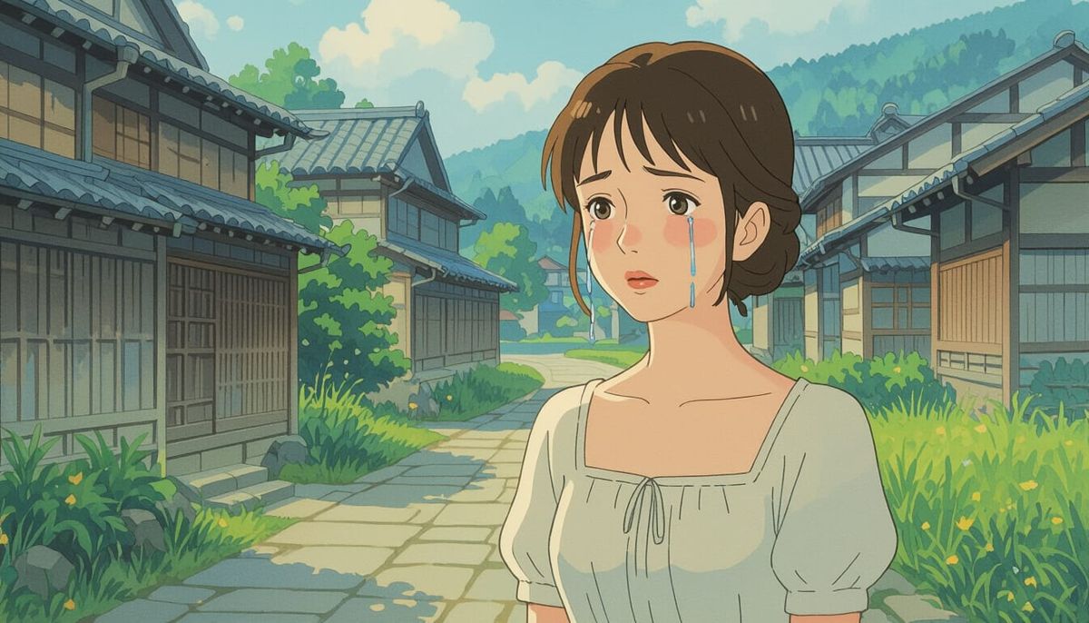 A sorrowful young woman cries in a quiet village scene. Her delicate features are highlighted in the style of watercolor painting with muted colors and gentle lighting. The image evokes a melancholic and emotional atmosphere.