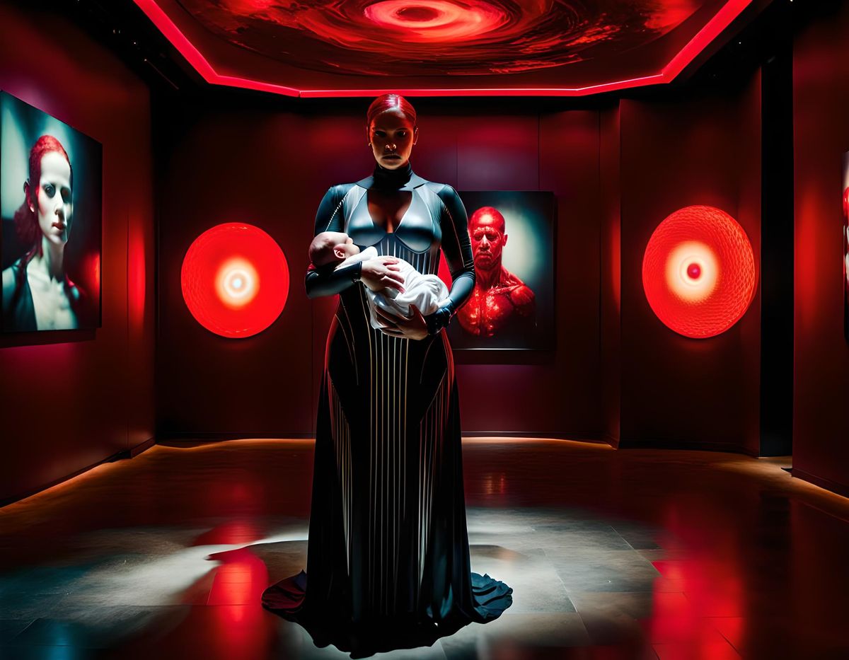 Cyborgs handling luminescent Babys luminous museum lobby cinematic film photography of Full body of a beautiful curvy body (Red_Eyes:1.9) luminescent Glow (cyborgs handling a luminescent Baby:1.9) : Mixed-Media photography by jeremy_mann andree_wallin Dan_Witz Peter_Gric Francis_Bacon : 4K Hyperrealism Masterpiece Chiaro Bright in the style of Ridley_Scott Carne_Griffiths Minjae_Lee Ana_Paula_Hoppe :: digital volumetric post_treatment Complex contrast Soft winter pastel colours :: Infinite depth_of_field post-treatment long shot