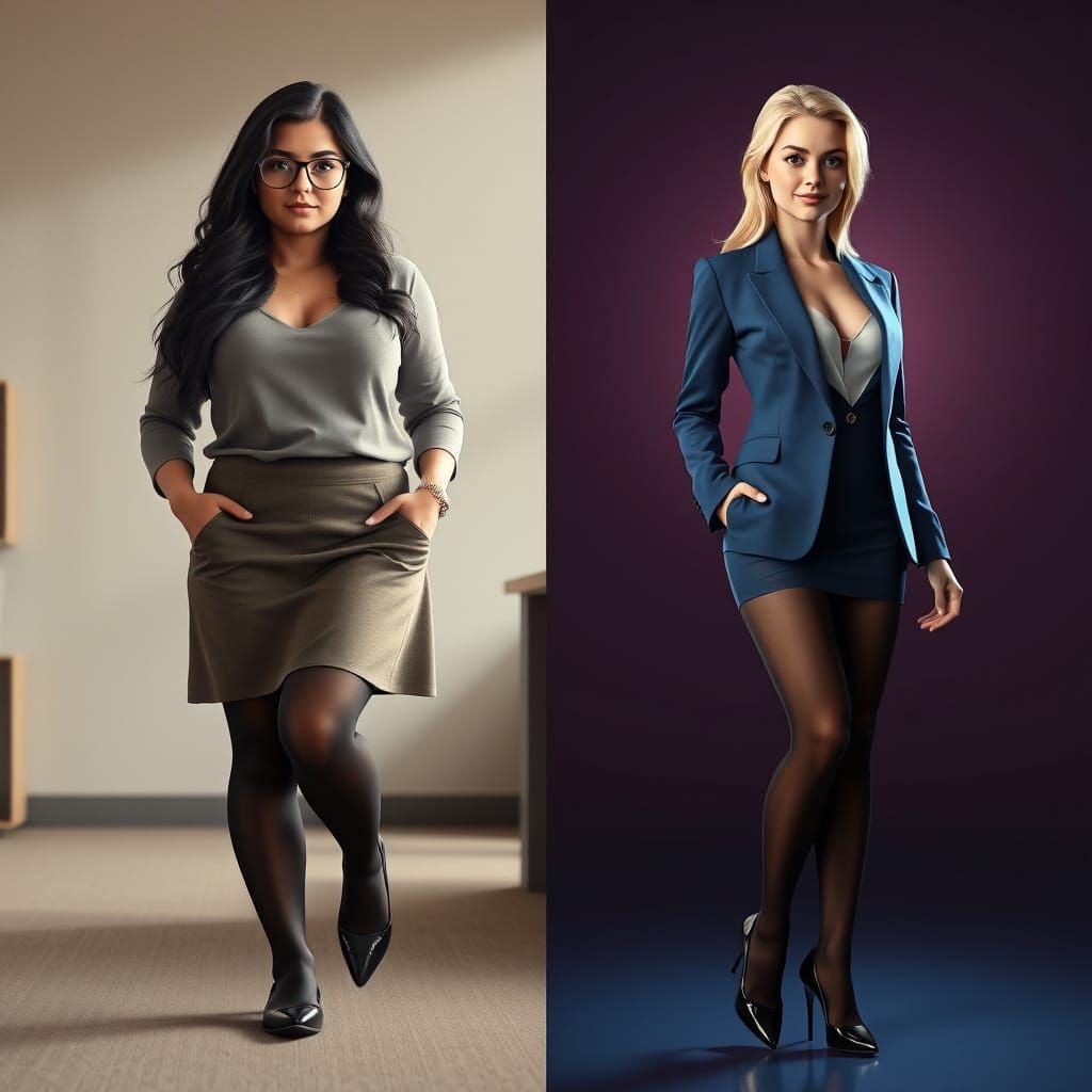 This stunning image shows a woman's dramatic transformation from a humble office worker to a confident businesswoman, with intricate details and textures inspired by Pixar and Disney concept art.