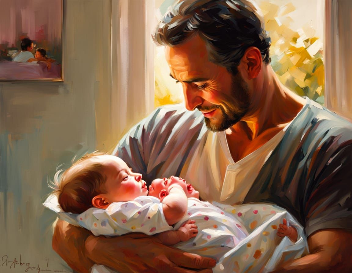 A heartwarming oil painting capturing a father tenderly holding his newborn daughter in a hospital setting. Soft brushstrokes and warm lighting evoke a sense of fatherly love and familial connection in earthy tones.