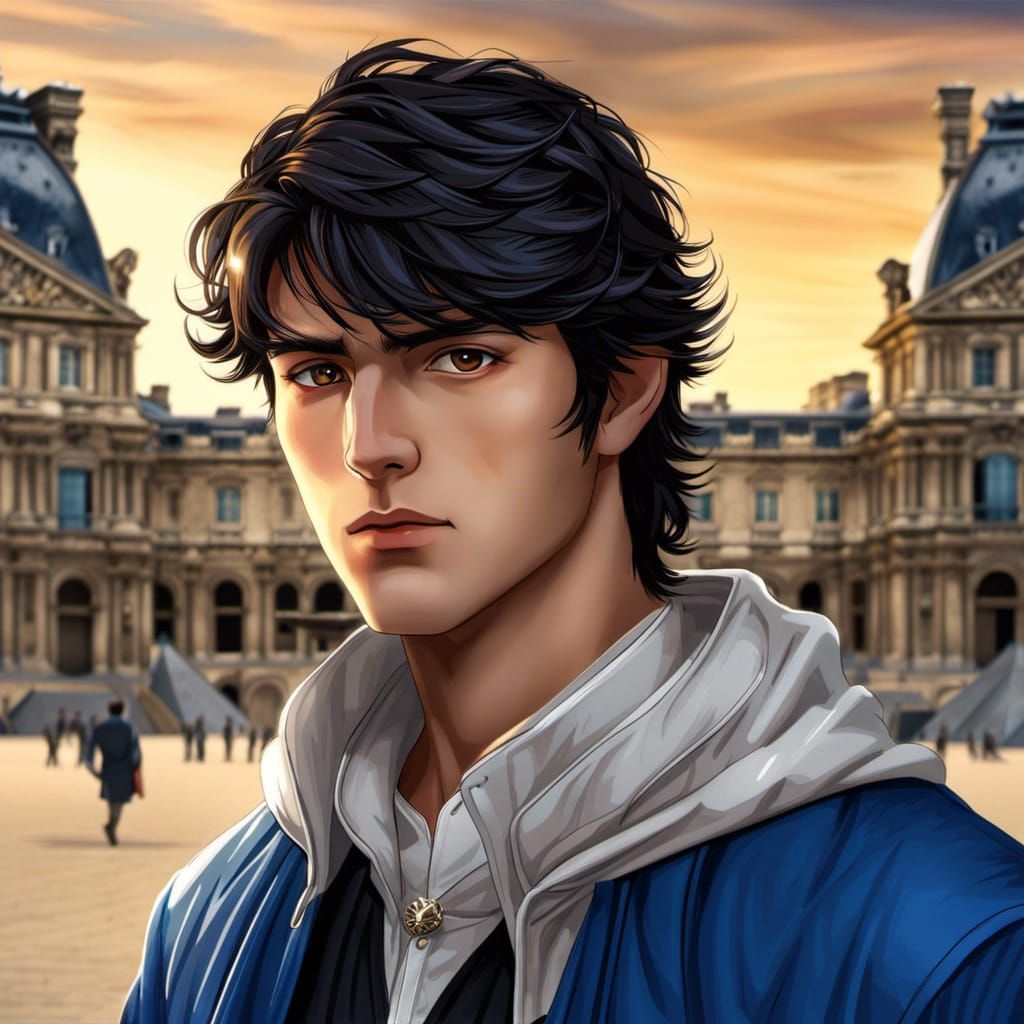 This image showcases a handsome man with dark hair and hazel eyes, dressed in blue, against the backdrop of the Louvre Pyramid in Paris. Rendered in a detailed anime style with deep colors and intricate details.