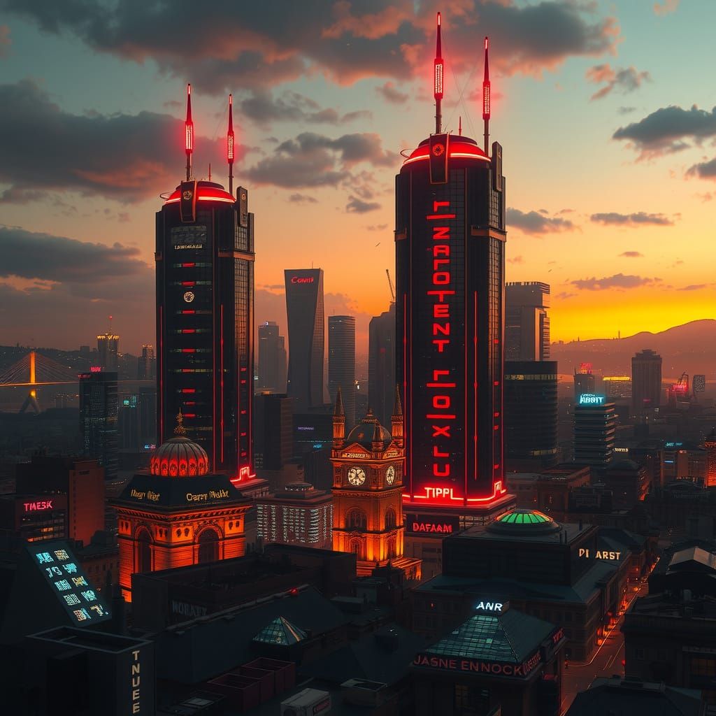 A cyberpunk cityscape inspired by Blade Runner, set in Istanbul. The image features neon-lit skyscrapers and a fantastical atmosphere, rendered with intricate details and deep colors as digital artwork.